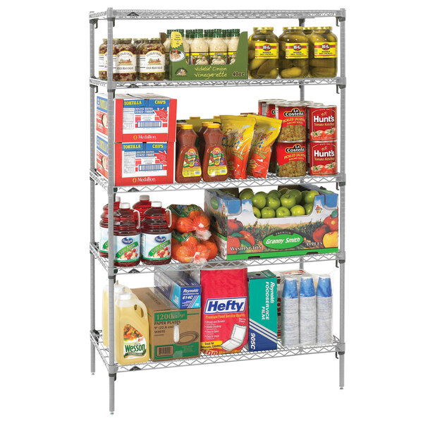 Construct a sturdy and spacious shelf system with the all-inclusive Metro 5A467C stationary Super Erecta Adjustable 2 chrome wire shelving unit! This convenient kit includes four 74" SiteSelect chrome posts and five 21" x 60" Super Adjustable 2 chrome shelves. Perfect for dry storage areas, this easily adjustable shelving unit allows you to simply increase your storage capacity by as much as 25%!
