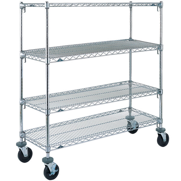 Construct a sturdy and conveniently mobile storage system with the all-inclusive Metro A466BC Super Adjustable chrome 4 tier mobile shelving unit! Four resilient rubber swivel casters allow you to easily move the unit for quick and efficient cleaning, while two of them lock to ensure reliable stability during day-to-day use. This kit includes four 21" x 60" Super Adjustable 2 chrome wire shelves which boast a unique corner release system that allows you to effortlessly adjust the shelves' position without the use of tools!