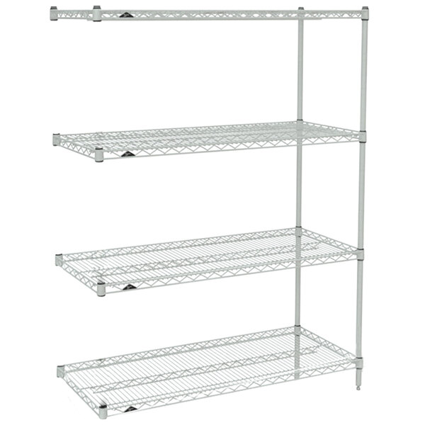 Maximize your shelf space with the Metro AN536K3 Super Erecta Metroseal 3 adjustable wire stationary add-on shelving unit! It attaches easily to your existing Super Erecta structure to instantly increase the storage capabilities of your facility. This convenient, easy-to-assemble kit includes a total of four 36" x 24" shelves, two 63" SiteSelect posts, and 8 "S" hooks. Perfect for damp environments such as walk-in freezers and refrigerators, the Metroseal 3 epoxy finish provides antimicrobial protection that resists bacteria, mold, mildew, and fungi that causes odors, stains, and degradation. Two "S" hooks are supplied per shelf and are used to easily attach the piece to its adjacent unit. In addition, an open wire design minimizes dust accumulation and provides increased visibility of the shelf's contents, ensuring the unit is easy to keep clean and organized.