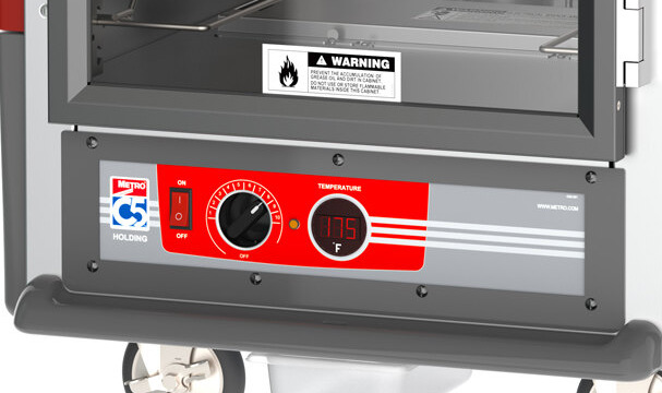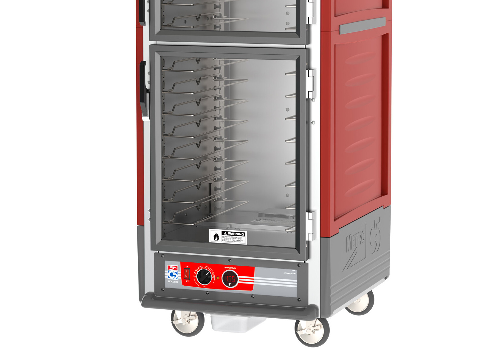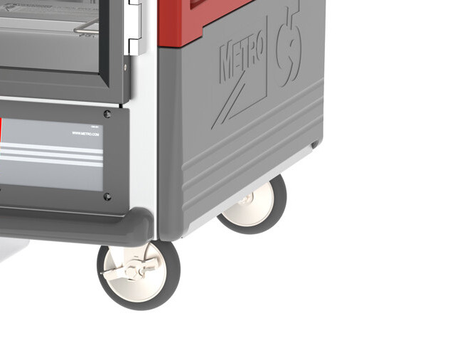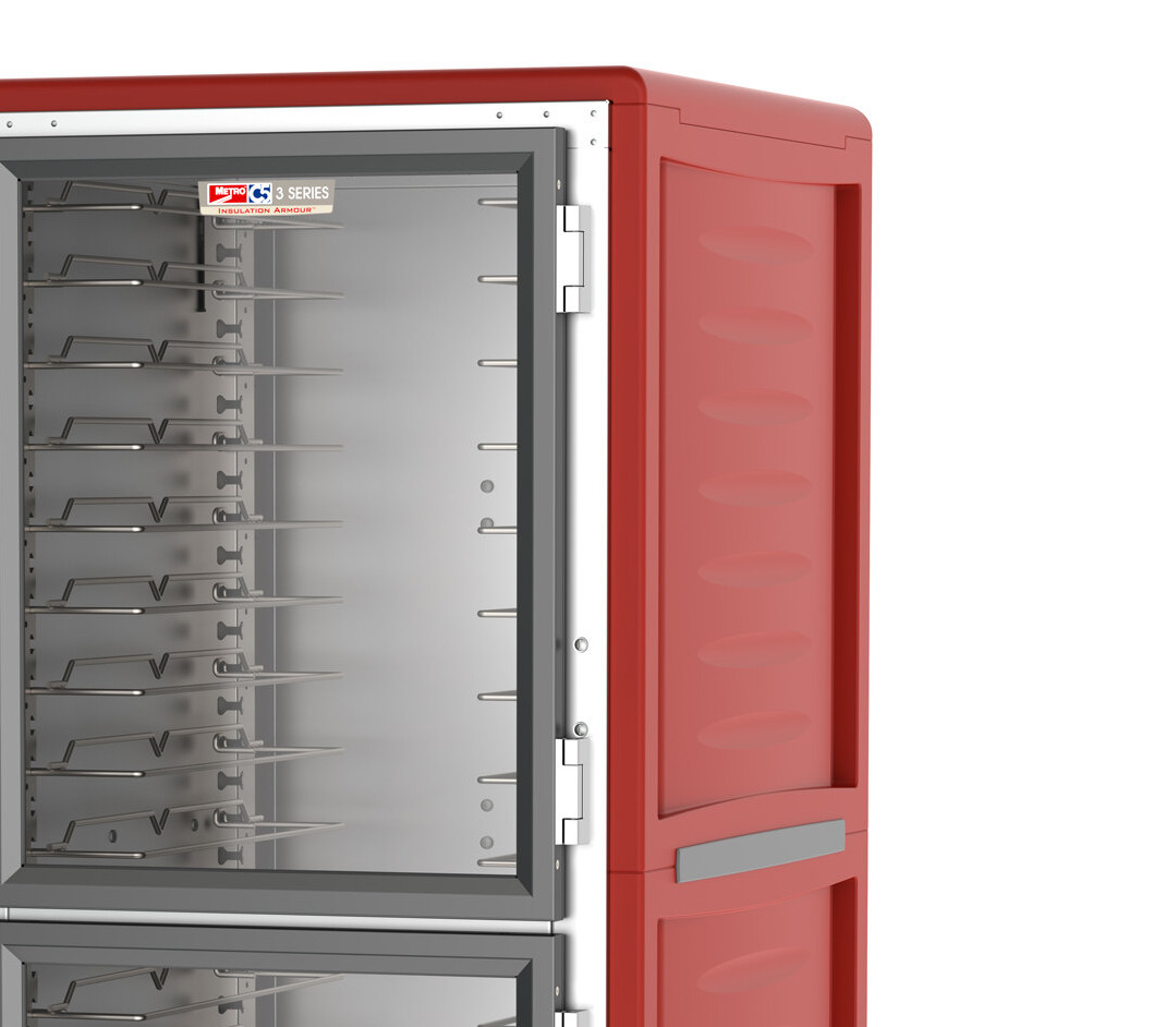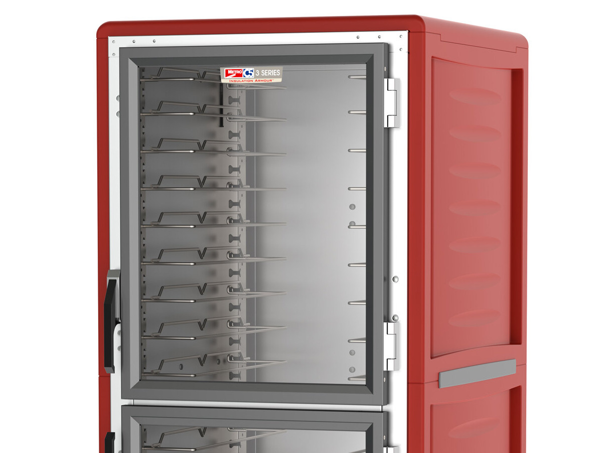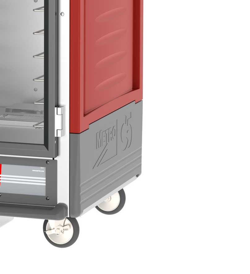 Built with patented insulation technology, this holding cabinet doesn't just retain heat, its exterior remains cool to the touch. This saves energy and as a result, saves you money. The hand holds are molded in vertically for easy maneuvering, and the exterior is made of durable red polymer, which provides a dent-resistant, impact-resistant, and stain-resistant construction, perfect for heavy use in bustling kitchens.