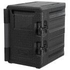 Perfect for any catering business, this convenient Metro ML400-BU Mightylite black front loading EPP insulated food pan carrier with blue door is both ultra-strong and ultra-light. Weighing only 11.3 lb., the unit is not only easy and comfortable to maneuver, but reduces the pain and strain involved with heavy, bulky loads. It features an impressive 8 handles, ensuring that it's easy to grip, regardless of how you pick it up. Plus, to maximize durability, the carrier's polymer foam construction absorbs impact, making it withstand drops, falls, and bumps with ease.