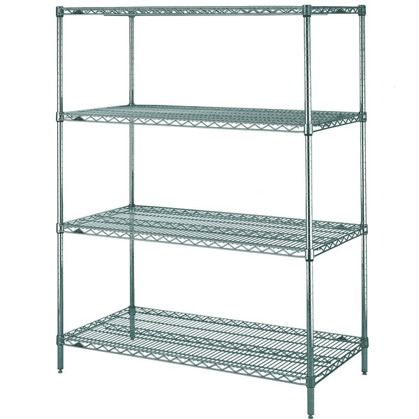 Create a sturdy and spacious shelving system that instantly increases your facility's storage capabilities with the Metro N316K3 Super Erecta Metroseal 3 adjustable wire stationary starter shelving unit! This convenient, easy-to-assemble kit includes a total of four 24" x 18" shelves and four 63" SiteSelect posts. Perfect for damp environments such as walk-in freezers and refrigerators, the Metroseal 3 epoxy finish provides antimicrobial protection that resists bacteria, mold, mildew, and fungi that causes odors, stains, and degradation. In addition, an open wire design minimizes dust accumulation and provides increased visibility of the shelf's contents, ensuring the unit is easy to keep clean and organized.