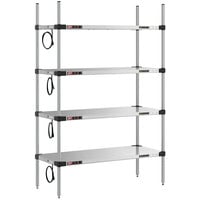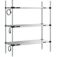 A great way to add a convenient heated storage and prep solution to a wide variety of operations, this Metro Super Erecta 24" x 30" stainless steel heated takeout shelf station offers the reliable performance you need and demand! Unlike wire shelving where small components may slip through the cracks or leaking packages may contaminate products on lower shelves, these solid shelves allow you to confidently store products of any type and size. The shelves feature an aluminum core that keeps finished plates fresh and warm for service, or ingredients you need to keep warm while prepping. A thermostatic dial allows you to precisely choose your shelf temperature up to 200 degrees Fahrenheit and is easily turned on and off with a switch. Note that the minimum clearance from the bottom of the shelves to any combustible surface is 1 1/2", and the recommended spacing between shelves is 5 3/4".