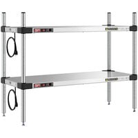 An excellent choice for everything from ingredient to service applications, the shelves' solid, flat surfaces also make them extremely simple to clean. For durability and long-lasting performance, they are made of 18 gauge type 304 galvanized steel. Plus, the shelves feature black epoxy-coated corners to prevent accidents and injury when the heat is turned on. This unit also features 4 chrome posts that're fitted with adjustable leveling bolts so that you can easily compensate for uneven surfaces. A sleek chrome finish makes the posts perfect for dry storage areas, while crystal clear engravings make installing a full shelving unit easier than ever. They're grooved at 1" increments, numbered at 2" increments, and double grooved every 8" to provide you with a visual guide that makes positioning shelves a breeze. This unit requires a 120V electric connection for operation and comes with a cord and plug.