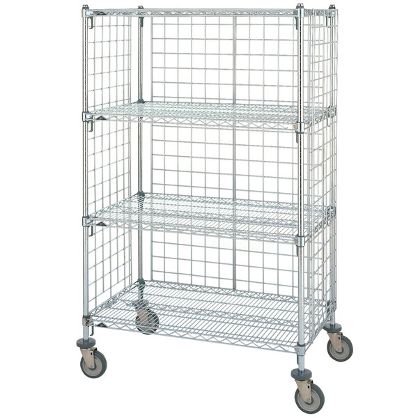 This versatile Metro Super Erecta AST35MC wire slanted shelving truck features three wire shelves, two of them slanting backwards to help avoid spills or upsets when moving the unit over uneven surfaces. The sturdy, open wire shelves on this truck allow for maximum air circulation and product visibility, while a chrome-plated finish keeps the entire unit looking great even after heavy use.