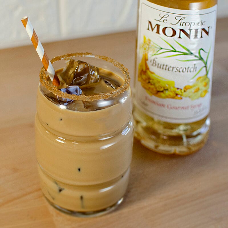Fill a serving glass with ice Pour 1 oz. Monin butterscotch flavoring syrup, 2 shots of espresso, and 6 oz. 2% milk into the glass, stirring well to mix. Garnish with whipped cream and serve.