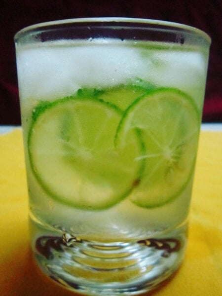 Fill serving glass full of ice. Pour ingredients into serving glass in order listed. Stir gently to mix. Add garnish and serve.