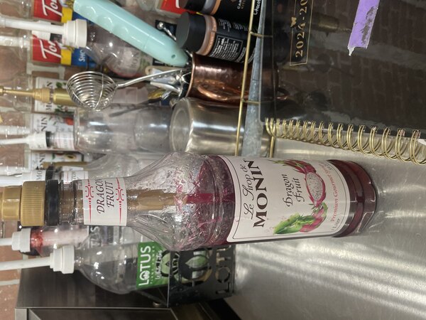 Add exotic fruit flavor to your beverages with this Monin 1 liter premium dragon fruit flavoring syrup! Featuring a sweet, juicy dragon fruit flavor with notes of strawberry, kiwi, and pear and a vivid fuchsia color, this syrup offers a quick and easy way to bring bold new flavor to a variety of your handcrafted cocktails, lemonades, sodas, and iced teas. Made with pure cane sugar and no artificial flavors, this all natural syrup will enhance the flavor profile of your mixed or blended drinks without overpowering them or being too sweet. You can even use this syrup to create unique sauces and marinades for your entrees or desserts!