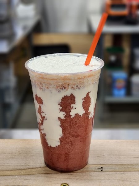 This smoothie mix is very sweet, but was fixed by blending with milk. We top ours with cold foam.