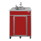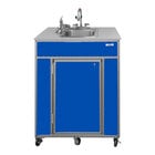 This unit comes with a self-contained sink with a durable stainless steel basin that requires no plumbing and has an electric pump, so it's ready to be plugged in and used. It has a 6 gallon internal tank for fresh water and an 8 gallon tank for waste water, and it provides 15 minutes of continuous water flow. The handwashing faucet provides both hot and cold water with an adjustable heater with a temperature range of 95-140 degrees Fahrenheit, while the eye washing faucet provides only cold water. This sink's cabinet boasts a bold black color. Seamlessly move your washing station to where it's needed most using this portable unit! This unit requires a 110/120V electrical connection for operation.