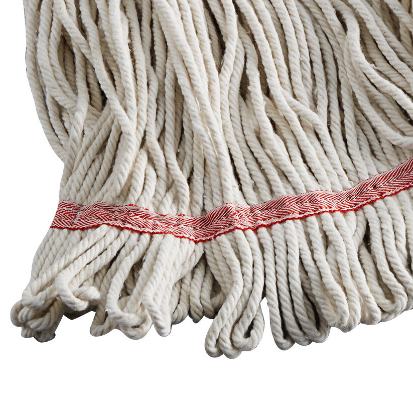 Good, cheap mop head that we use at our coffee shop. They do a decent job cleaning the floors and the actual head cleans up great in a laundry machine with some bleach. The middle band makes securing to a handle easy and quick!