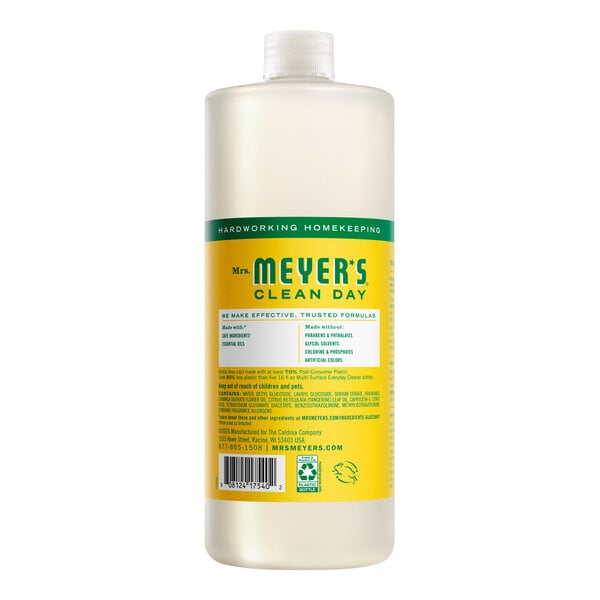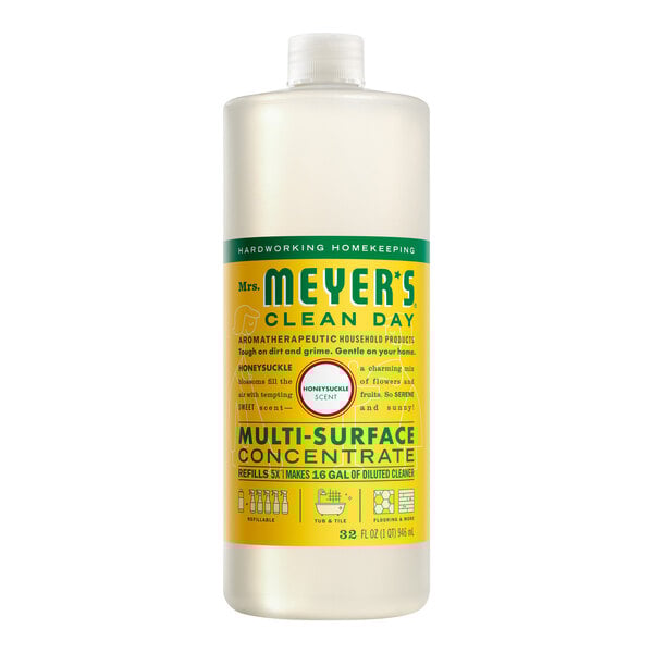 Keep your space squeaky clean with Mrs. Meyer's Clean Day 389630 32 fl. oz. honeysuckle all purpose multi-surface cleaner concentrate . This concentrated all purpose cleaner is packed with plant-derived surfactants and emulsifiers to help remove dirt and grime without leaving behind harmful odors or residue. Simply combine 1/4 cup concentrate with 1 gallon warm water and begin cleaning floors, cupboards, and countertops. Enhanced with essential oils, this honeysuckle all purpose cleaner brings a cooling floral scent to your everyday cleaning.
