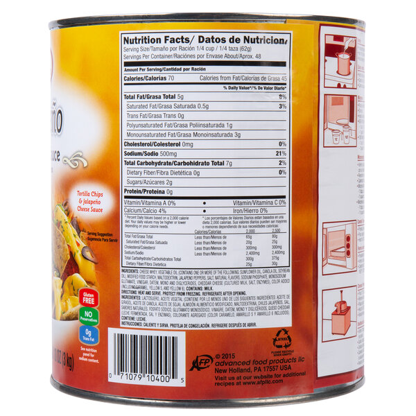 Using Muy Fresco jalapeno nacho cheese sauce, you can provide irresistibly cheesy flavor with the convenience of a canned product. The size of the #10 can is great for foodservice applications. It keeps your cheese sauce staying fresh, allowing you to safely store cheese sauce in your kitchen or concession stand without refrigeration.