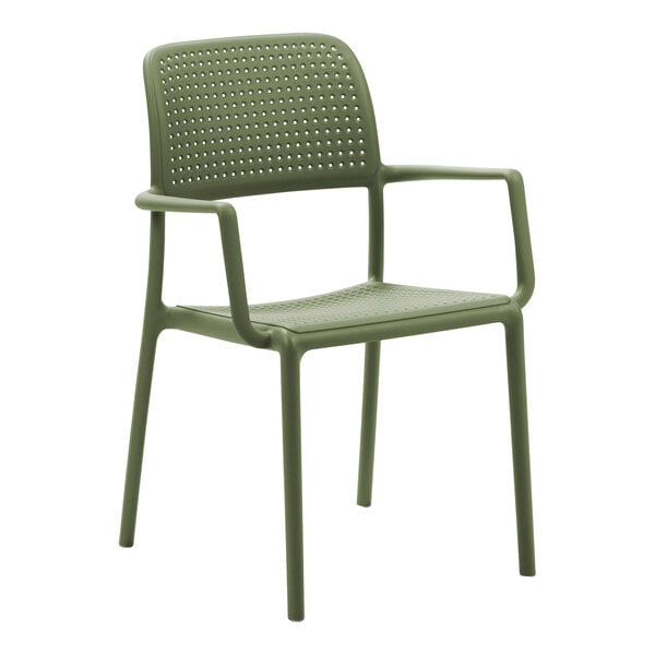 Enhance your outdoor dining experience with this Nardi Bora agave resin stackable outdoor arm chair. This durable chair is crafted with recyclable fiberglass polypropylene resin with a matte finish, and it is uniformly colored with non-toxic pigments. Built to withstand the elements, it is also treated with anti-UV agents that protect the color from fading with sun exposure, providing long-lasting use. Its weather-resistant design ensures that it will maintain its sleek appearance and attractive agave green color in outdoor conditions, making it perfect for use in outdoor dining areas, patios, and bars.
