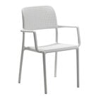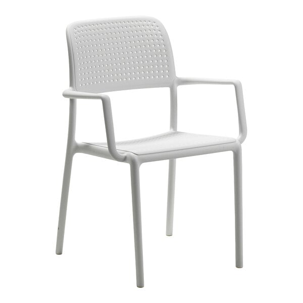 Enhance your outdoor dining experience with this Nardi Bora bianco resin stackable outdoor arm chair. This durable chair is crafted with recyclable fiberglass polypropylene resin with a matte finish, and it is uniformly colored with non-toxic pigments. Built to withstand the elements, it is also treated with anti-UV agents that protect the color from fading with sun exposure, providing long-lasting use. Its weather-resistant design ensures that it will maintain its sleek appearance and attractive bianco white color in outdoor conditions, making it perfect for use in outdoor dining areas, patios, and bars.
