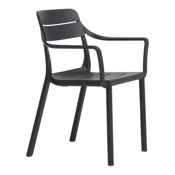 As part of the Cassia collection, this chair features stylized horizontal slats, ergonomic arm rests, and an attractive antracite black color. Its one-piece construction is light weight and stackable, allowing for easy transportation and storage. Additionally, it has non-slip feet that keep the chair in place. This chair seamlessly combines style and functionality to create an inviting outdoor setting for your guests. Whether you're setting up a cafe patio or a bustling restaurant terrace, this chair is the perfect choice for adding a simple, modern touch to your outdoor dining space.