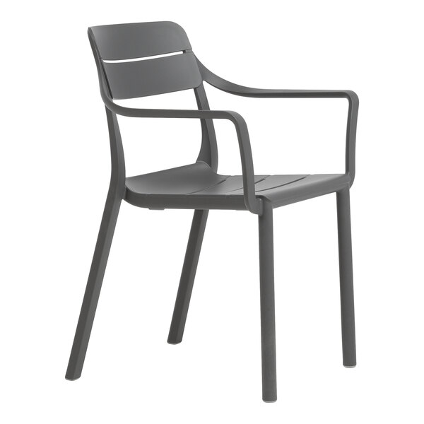As part of the Cassia collection, this chair features stylized horizontal slats, ergonomic arm rests, and an attractive basalto gray color. Its one-piece construction is light weight and stackable, allowing for easy transportation and storage. Additionally, it has non-slip feet that keep the chair in place. This chair seamlessly combines style and functionality to create an inviting outdoor setting for your guests. Whether you're setting up a cafe patio or a bustling restaurant terrace, this chair is the perfect choice for adding a simple, modern touch to your outdoor dining space.
