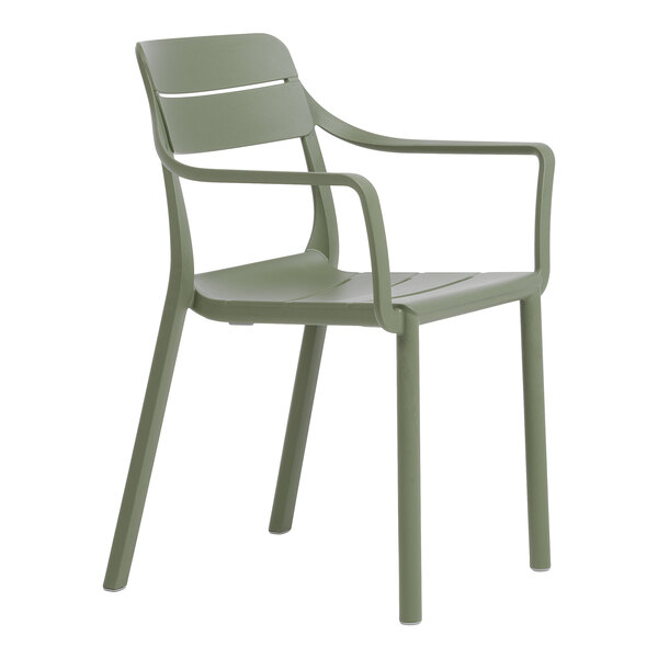 As part of the Cassia collection, this chair features stylized horizontal slats, ergonomic arm rests, and an attractive cactus green color. Its one-piece construction is light weight and stackable, allowing for easy transportation and storage. Additionally, it has non-slip feet that keep the chair in place. This chair seamlessly combines style and functionality to create an inviting outdoor setting for your guests. Whether you're setting up a cafe patio or a bustling restaurant terrace, this chair is the perfect choice for adding a simple, modern touch to your outdoor dining space.