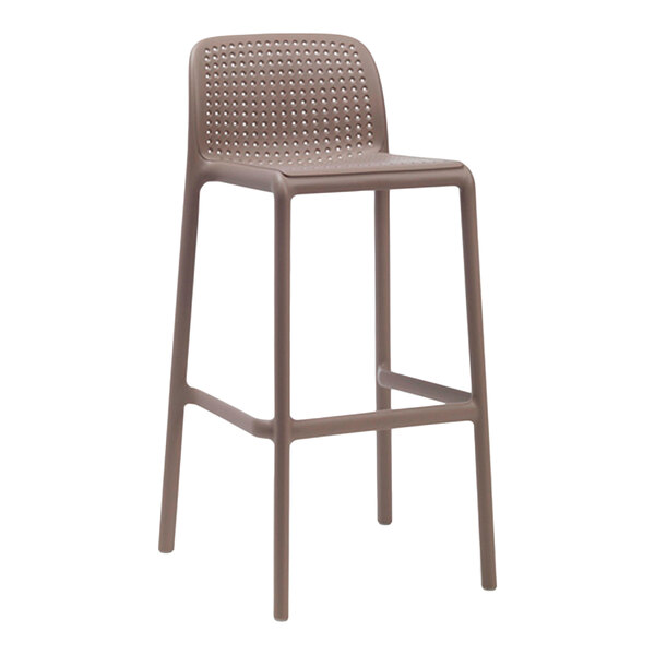 Enhance your outdoor dining experience with this Nardi Lido tortora resin stackable outdoor barstool. This durable barstool is crafted with recyclable fiberglass polypropylene resin with a matte finish, and it is uniformly colored with non-toxic pigments. Built to withstand the elements, it is also treated with anti-UV agents that protect the color from fading with sun exposure, providing long-lasting use. Its weather-resistant design ensures that it will maintain its sleek appearance and attractive tortora brown / beige color in outdoor conditions, making it perfect for use in outdoor dining areas, patios, and bars.