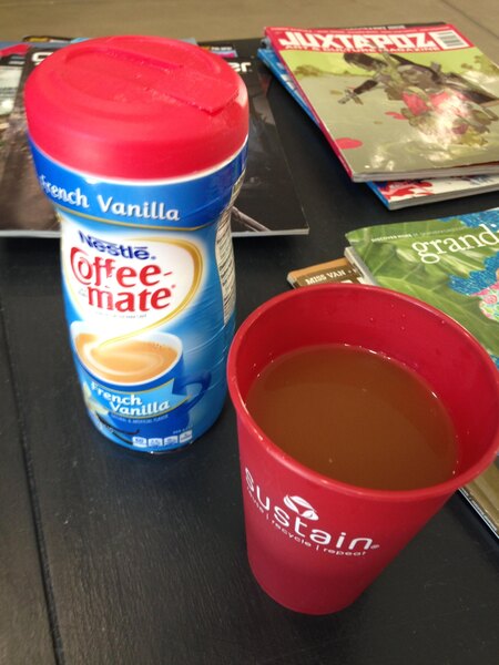 Good french vanilla flavor Coffee Mate Creamer by Nestle. You can get a whole case of 12 so you don't run out. Shaker cap and sturdy plastic container.