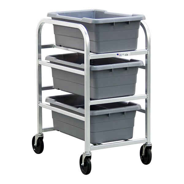 Easily transport bulk food with this New Age Heavy-Duty series lug dolly. Designed to hold 3 lugs (sold separately), this rack is perfect for transporting food, dishes, or even equipment throughout your facility. It holds lugs by the bottom instead of the lip, allowing you to store various sizes of lugs up to 27" x 16 1/4" x 9 1/2". Plus, it features 10" of spacing between each shelf. This rack has a 300 lb. capacity and rolls on (4) 5" stem-type swivel casters for easy mobility.