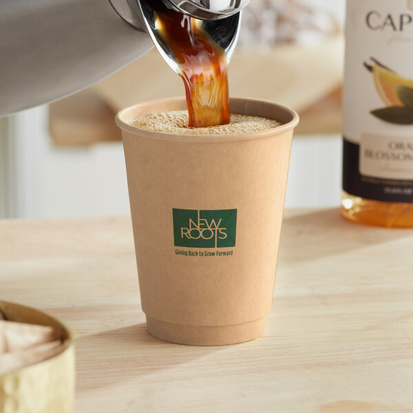 Its versatile kraft color has simple, clean graphics and conveys a neutral look that will blend into any establishment. It is the ideal hot beverage solution for concession stands, coffee shops, convenience stores, cafeterias, or office break rooms. The PLA lining ensures that the cup won't weaken from holding hot liquids over time, making it perfect for your piping-hot signature beverage.