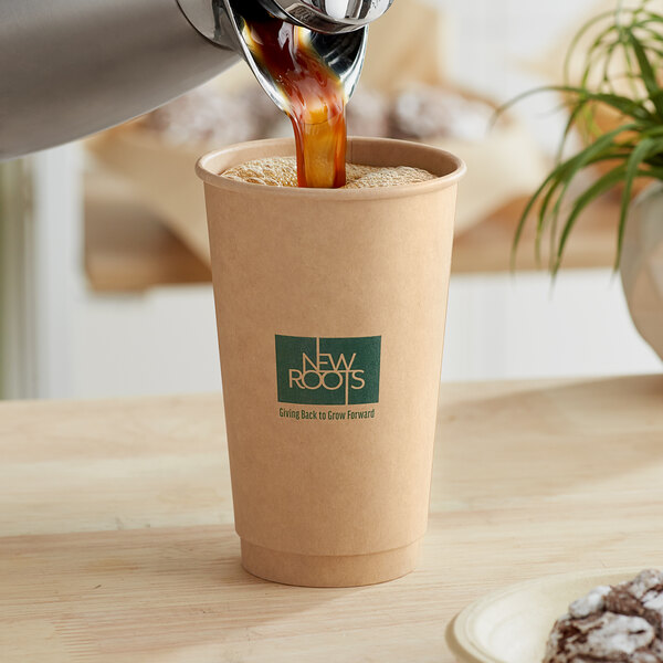Its versatile kraft color has simple, clean graphics and conveys a neutral look that will blend into any establishment. It is the ideal hot beverage solution for concession stands, coffee shops, convenience stores, cafeterias, or office break rooms. The PLA lining ensures that the cup won't weaken from holding hot liquids over time, making it perfect for your piping-hot signature beverage.