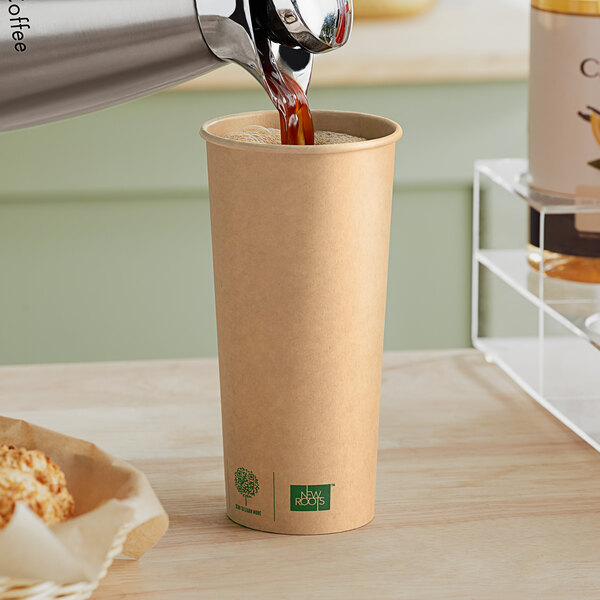 Its versatile kraft color has simple, clean graphics and conveys a neutral look that will blend into any establishment. It is the ideal hot beverage solution for concession stands, coffee shops, convenience stores, cafeterias, or office break rooms. The PLA lining ensures that the cup won't weaken from holding hot liquids over time, making it perfect for your piping-hot signature beverage.