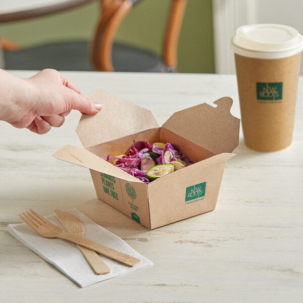 Make an impact on your community with this New Roots kraft PLA-lined compostable #1 take-out container! This sustainable product is ideal for businesses wishing to reduce their environmental footprint while giving back to the community. Packaged in bulk, this product is great for high-volume use in your bakery, restaurant, bistro, or catered event.