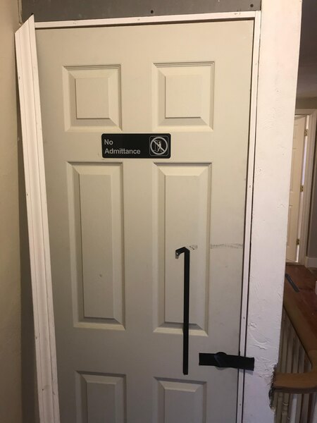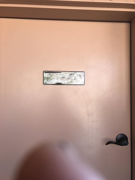 I really like this no admittance sign it was very easy to install and had to double-sided sticky tape‘s already on it so I was you had to do was pull off a little piece of paper and stick it to the door