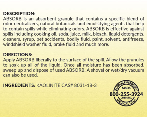To use Absorb, simply spread it over the surface of the spill to allow the granules to absorb any liquid and odors. When cleaning up, sweep the granules into a dustpan and dispose of them in a waste bin.