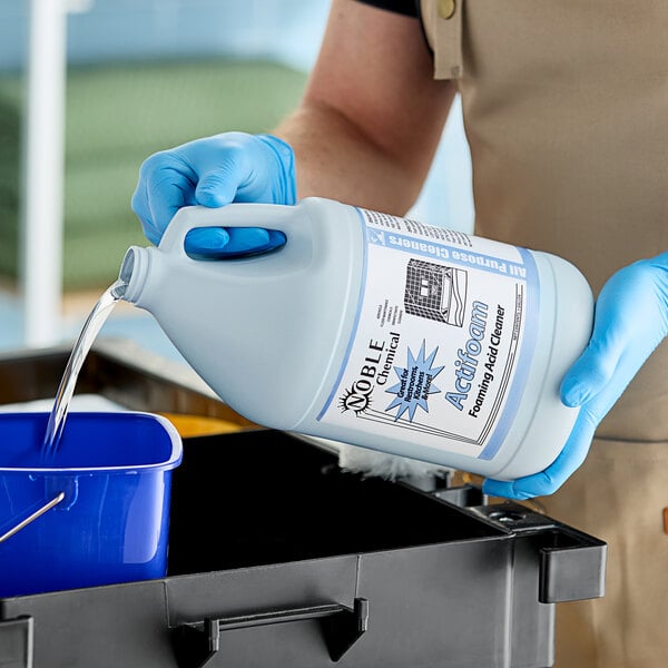 Noble's 1 Gallon Actifoam acidic foam restroom cleaner is a must-have for any public bathroom. Keeping your restrooms clean and smelling great is important for any business, and a dirty bathroom can negatively influence how customers view your restaurant, retail store, or institution. This product will effectively rid your bathroom surfaces of a variety of unsavory substances, including oil, scale, urinary salts, and soap film. You can use Actifoam to clean sinks, toilets, tile floors, stainless steel chrome fixtures, and drinking fountains.