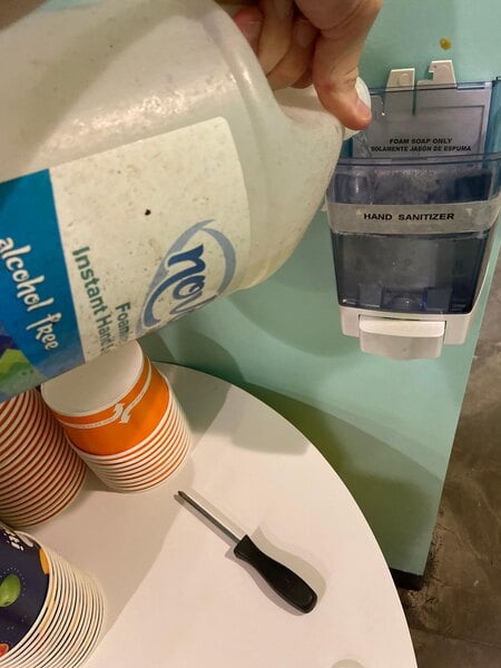 Really amazing how this liquid turns into a foaming sanitizer when placed in the dispenser. The amount that comes in each bottle last a very long time