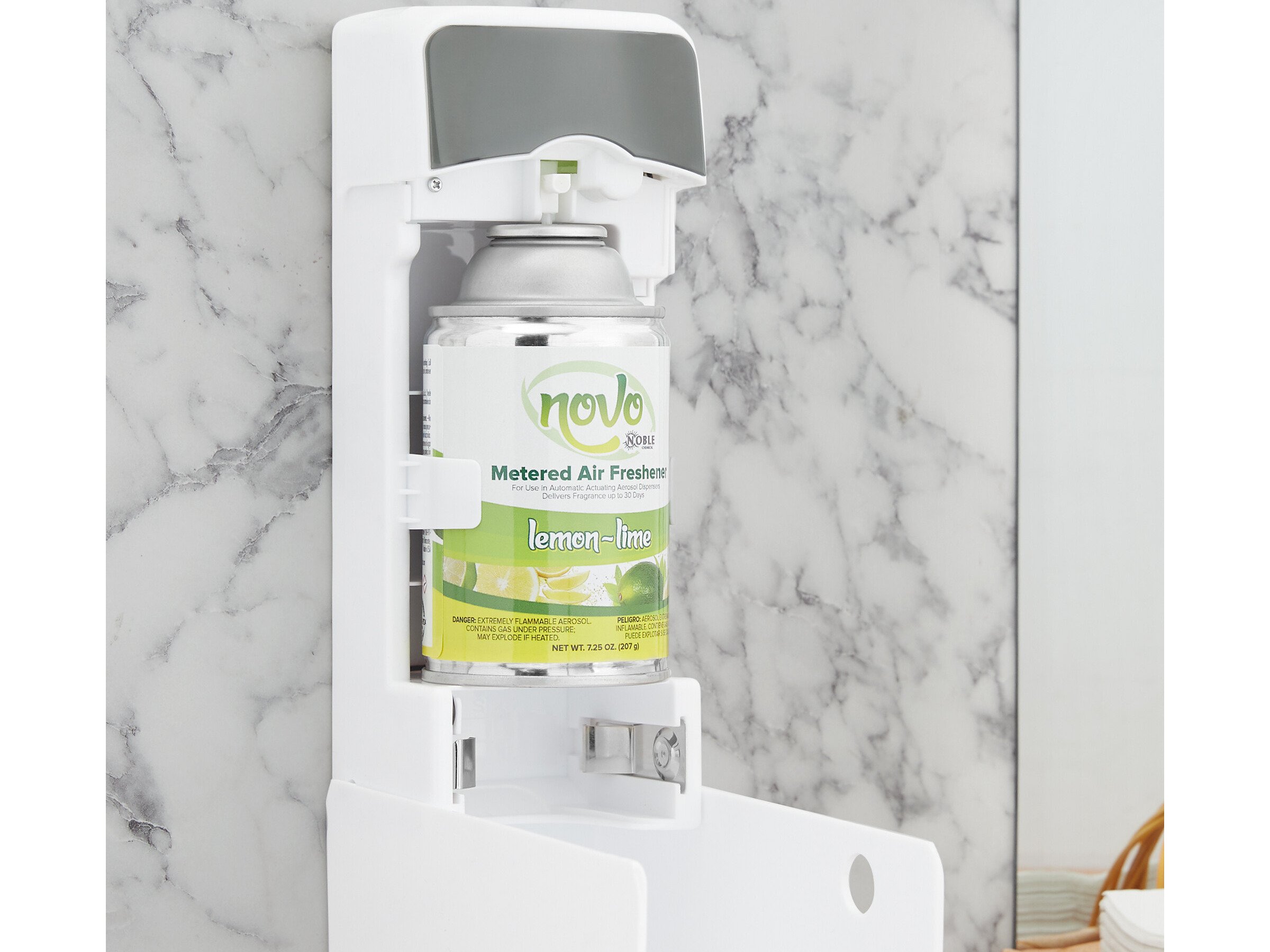 This air freshener refill works great in official Glade dispensers and will likely work fine in comparable off brand dispensers - the action and plunger style is almost identical to name brand. Out of all the scents we tried, this is the one our employees prefer. The summer rain gave some employees headaches, and cinnamon was too strong in general. One refill lasts about a month in a Glade dispenser set to the longest setting. Will be purchasing more in the future!