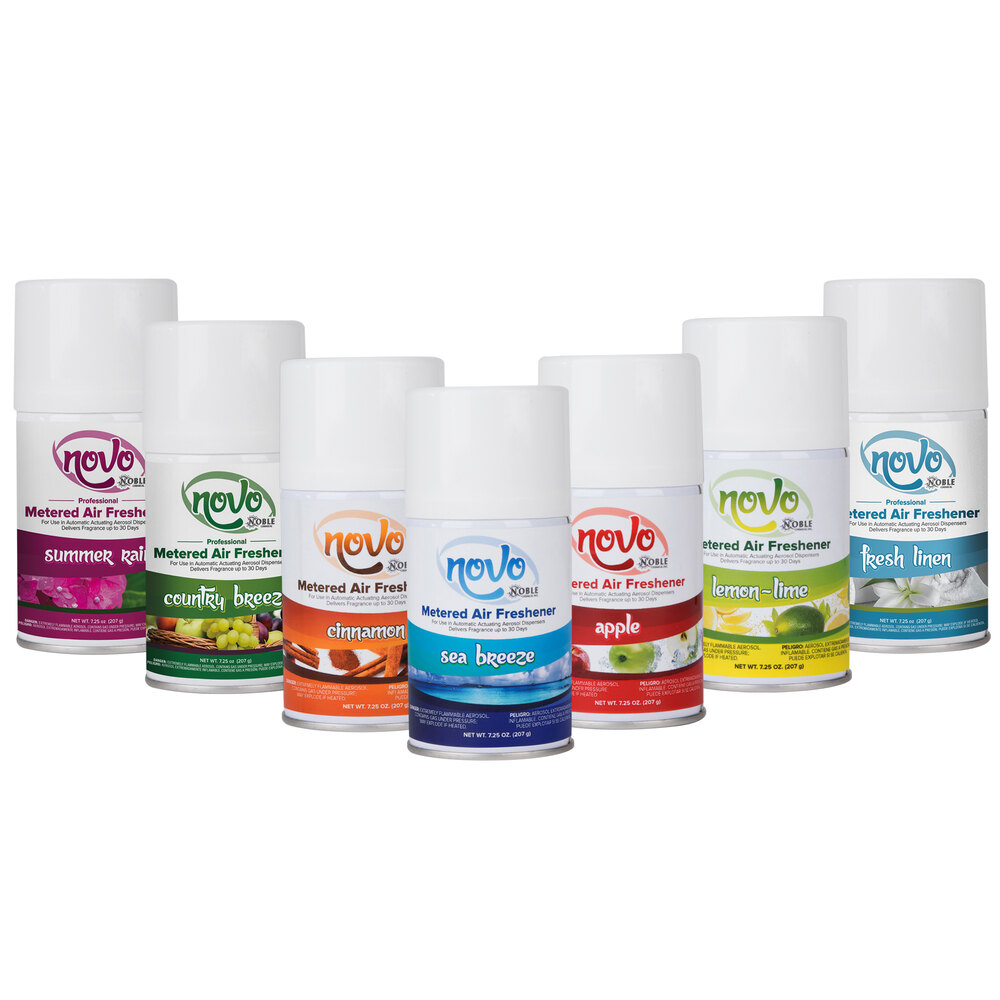 This Noble air freshener quickly neutralizes unpleasant odors and boasts a fine particle, non-staining, dry mist formula that stays suspended in the air long after odors have been destroyed to maintain a pleasant atmosphere in between sprays. To use, place the can inside the dispenser positioned for automatic actuation. For best results, the dispenser should be mounted above eye level.