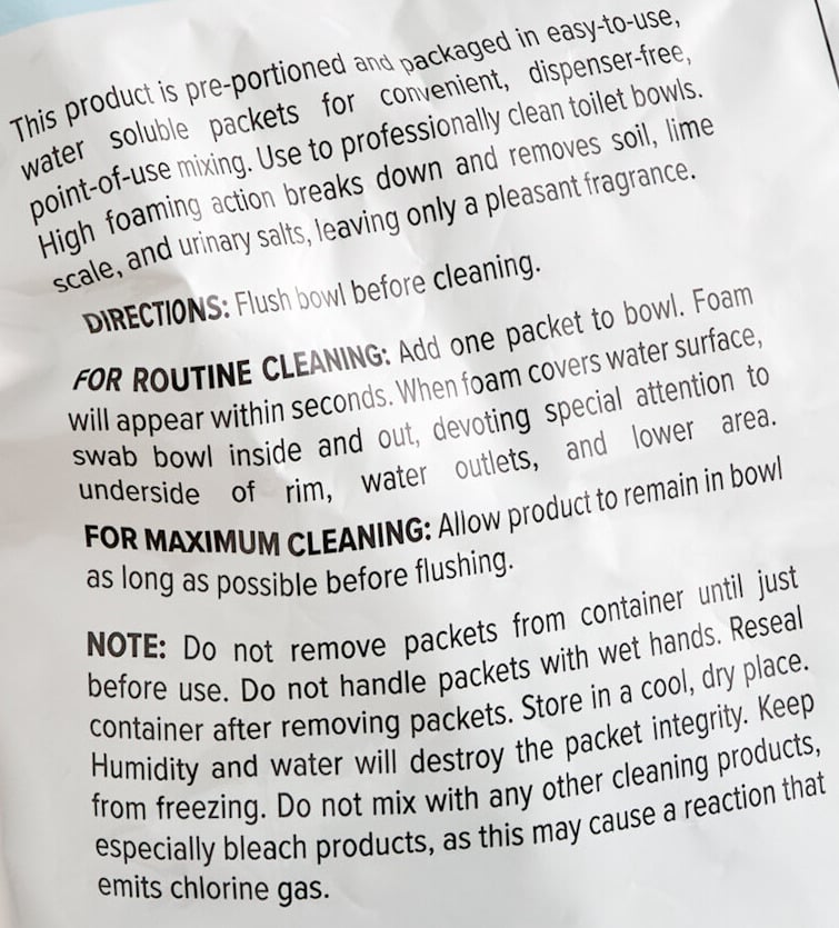 The easy-to-use packets quickly dissolve in water, leaving a solution ready for cleaning. To use, make sure to flush the toilet bowl before cleaning. Add one water soluble packet of bowl cleaner to the toilet bowl. Foam will appear within seconds. When foam covers the bowl surface, scrub inside, outside, and under the rim of the bowl. Make sure to let toilet stand as long as is practical or possible before flushing.