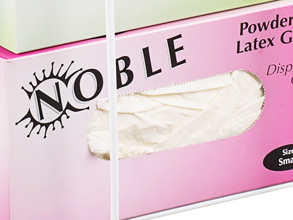 You would think that the products from the same company would be compatible; unfortunately, they are not. The wire rack is way too big for Noble glove boxes so they fall through the bottom. You have to get bigger boxes of gloves from another brand for this to work.