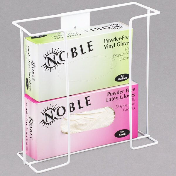 Keep your disposable gloves close at hand with this Noble white wire wall mount 2 box glove rack.