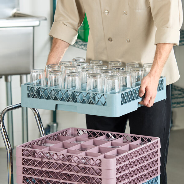This Noble Warewashing gray full-size 20-compartment glass rack gives you the flexibility you need with the outstanding adaptability, versatility, and durability you want in today's food service establishment! When used with racks of different colors or colored extenders (sold separately), this rack makes a great addition to a color-coded warewashing operation.