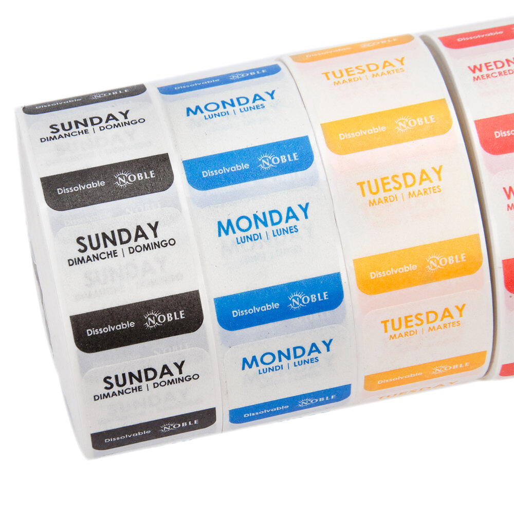 Provide your restaurant, bakery, or catering service with optimum organization and efficiency with this Noble 7-slot label dispenser kit! This kit comes complete with 7 separate rolls of dissolvable day-of-the-week labels - a roll for every day of the week.