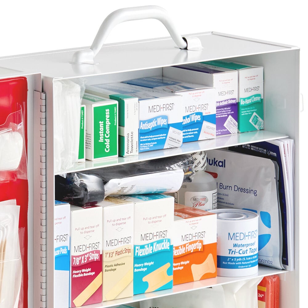 This cabinet features side latches to keep it shut and a carrying handle for easy mobility when you need to bring the kit to the injured person.
