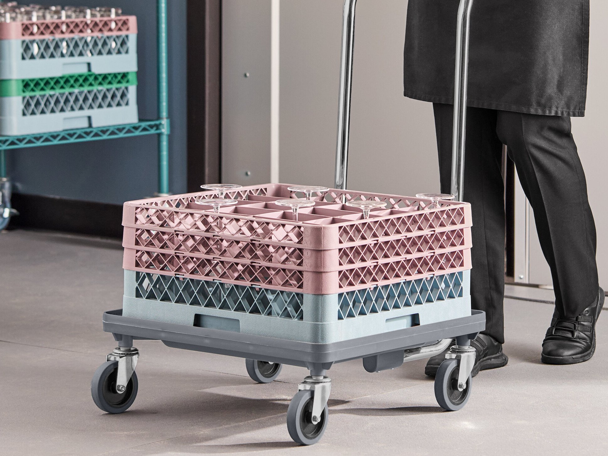 You must have a dolly for your racks! Easy way to tranasport heavy glasses from our dishwasher to the bar.