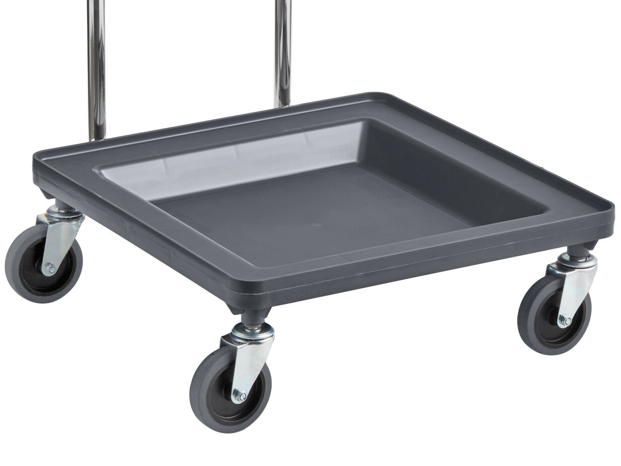This dolly features a 21" x 21" square design with an indented surface to securely hold standard size glass racks from all the most popular brands, including Noble, Cambro, Carlisle, and many others.