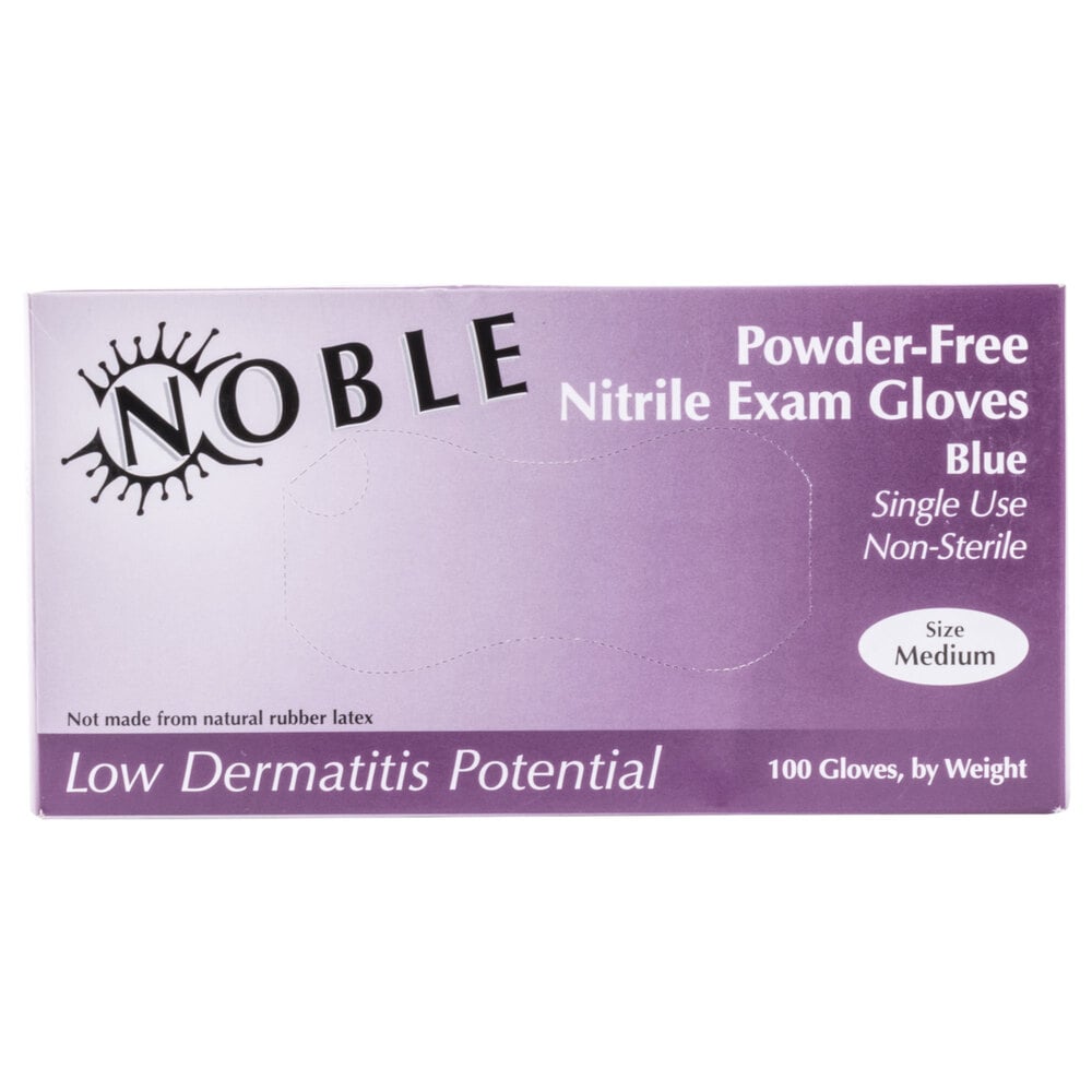 Noble low dermatitis potential 4.5 mil nitrile gloves provide exceptional puncture, tear, and chemical resistance. Thanks to textured fingertips, they also provide a firm grip in both wet and dry situations. They are ideal for food service operations, janitorial tasks, medical exams, dentist offices, nursing homes, veterinary clinics, and schools.