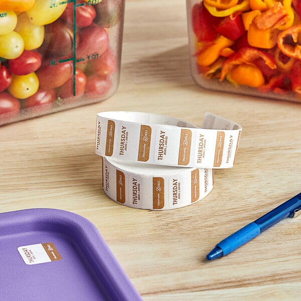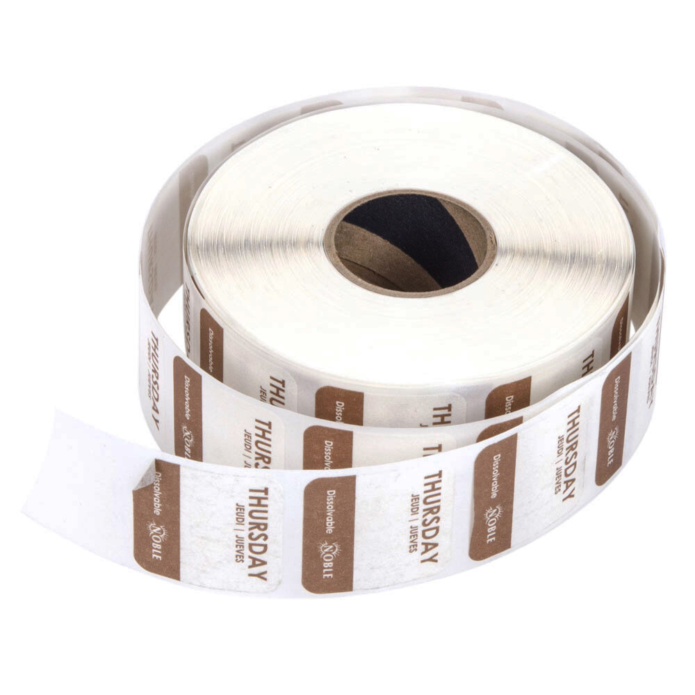 Featuring a "Thursday" label, this Noble dissolvable day of the week label keeps your food up-to-date! Great for First In, First Out (FIFO) organization of any perishable items, this 1" square label features brown colored print and border on a white background, making it easy to identify in any kitchen.
