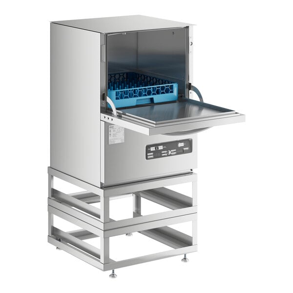 This powerful dishwasher combines with the convenience of a stand to elevate the machine and reduce strain, creating an ideal asset for your busy foodservice establishment. It comes with two durable stainless steel stands that stack and install into one, providing a height of 17 11/16" with adjustable feet that can raise it to 18 11/16". This unit requires a 208/230V electrical connection for operation.