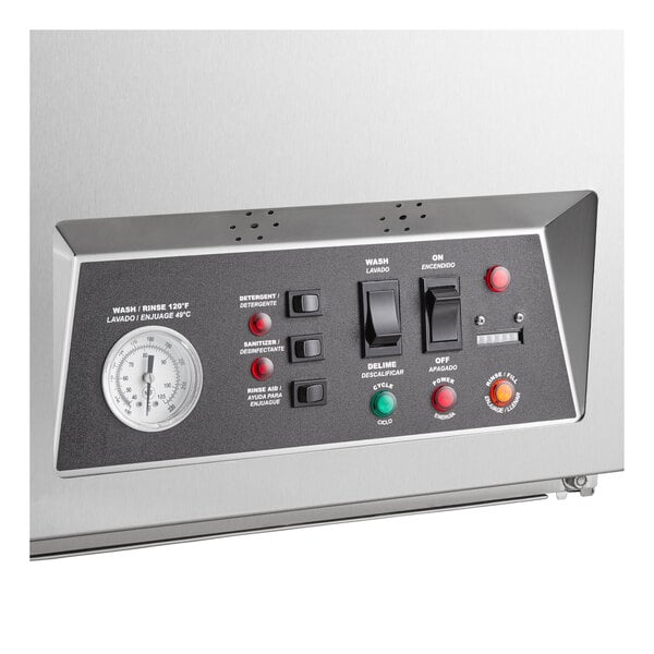 This low temperature warewashing machine comes with built-in chemical pumps and priming switches. It also features a low product indicator light, which illuminates when the detergent and sanitizer are low. This serves to alert the operator that the chemicals need refilled for continued warewashing service.