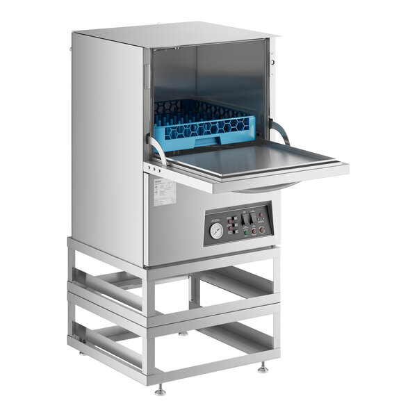 This powerful dishwasher combines with the convenience of a stand to elevate the machine and reduce strain, creating an ideal asset for your busy foodservice establishment. It comes with two durable stainless steel stands that stack and install into one, providing a height of 17 11/16" with adjustable feet that can raise it to 18 11/16". This unit requires a 115V electrical connection for operation.