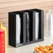 This organizer has non-slip rubber feet to keep it in place during use. It also features removable dividers for fast, efficient cleaning. Its durable plastic construction is built for increased longevity as well, while its classic black color is bound to blend in with any style of decor! Designed for use near condiment dispenser pumps (sold separately), this item is great for creating an efficient serving system at your establishment to easily provide guest with ketchup, mustard, or another fan-favorite condiment. You can even mount this organizer to the wall if you need to better optimize your space. Keep your countertops clean and tidy with the help of this 4-section countertop portion cup and lid organizer!