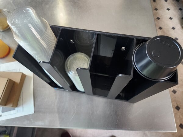 The three-compartment table top lid organizer was great for a 1.5 Oz Choice cups. It allowed us to add to full layers of Cups and tops on out to go tabletop station. It's a great addition to any restaurant I wish it was wider and had more columns for more cups and tops